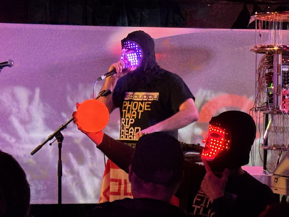 …. which continued when Leg Puppy 2.0 stepped up to do their thing ……. and what a thing it was! 😁 Darren’s sharp witty observations about the everyday things that wind him up (along with a big portion of the population I suspect), blended with classic sounding rhythmic hooks inspired by the 80’s-90’s glory days of electro, techno and rave, are an irresistible and addictive brew. All the while, a mysterious masked cohort in crime weaved constantly amongst the crowd, sans fully illuminated face mask and juggling a glowing orb. Utterly fantastic !